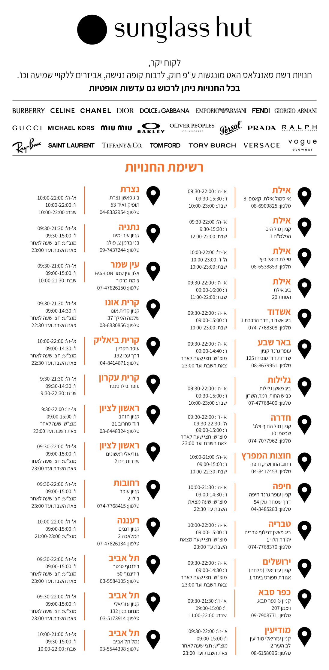 Sunglass Hut רשת משקפי השמש הבינלאומית המובילה והנחשקת, מקבוצת אסילור לוקסוטיקה.הרשת מציעה את קולקציות משקפי השמש החדשות והמעודכנות ביותר של מותגי האופנה ומותגי העל הבינלאומיים המובילים בעולם, ביניהם: Ray-Ban, Oakley, Prada, Versace, Dolce & Gabbana ועוד רבים.
